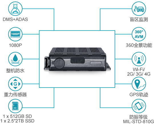 敏视八通道智能高清防水车载硬盘录像机一体机系统采用H.264/H.265压缩技术,支持实时远程监控, 可实现更智能、更全面的车辆管理!同时,该智能MDVR采用多核处理器和性能强大的神经网络推理引擎,集成ADAS、DMS、BSD、360全景等算法,一台MDVR可搭配出多种功能强大的一体机系统,实现车载录像机集合ADAS和DMS、360全景驾驶辅助系统或是盲区检测系统,无需额外安装即可进一步保障安全驾驶,大大地节省了成本和安装时间!