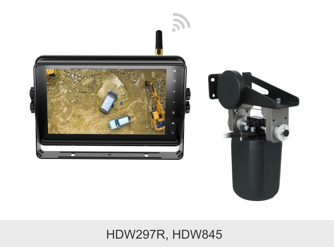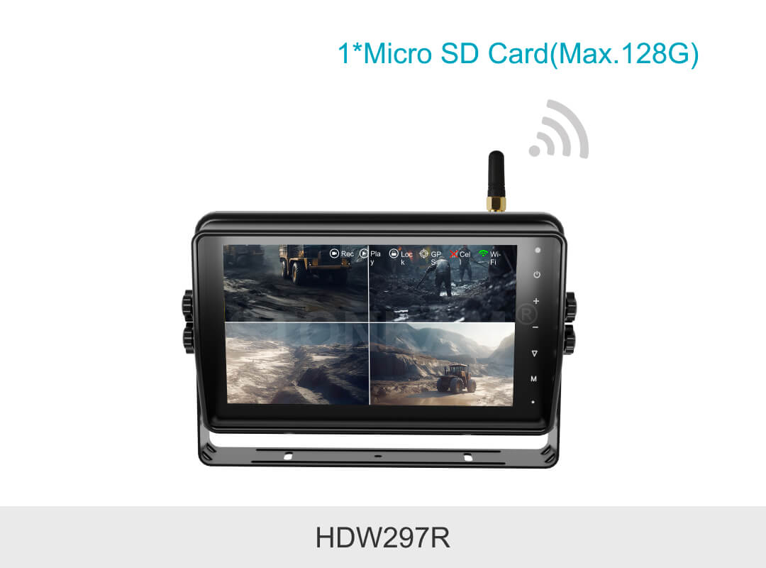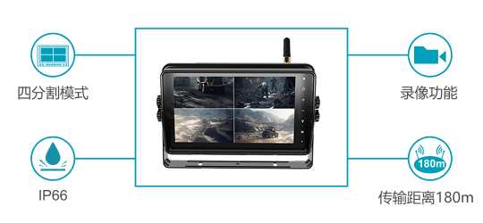 敏视10.1寸高清无线四分割车载录像监控显示器具有IP66防水外壳,配备录像和触屏功能;空旷传输距离最远达180m,信号稳定抗干扰,支持多画面显示模式,适用于卡车,叉车,矿车等各种车辆。