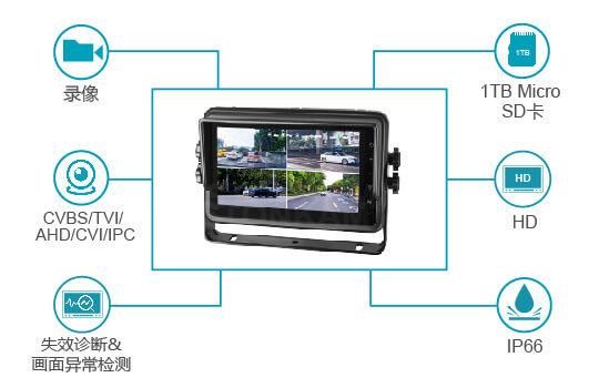 敏视7寸四分割防水车载录像监控显示器,自带录像功能,支持自动循环录像与报警触发录像,确保关键时刻的记录不遗漏。兼容CVBS/TVI/AHD/CVI/IPC等不同信号的摄像头,可灵活调整多种显示模式,实现全方位监控。IP66防水设计,无惧各种天气挑战。支持多种失效诊断与画面异常检测与预警,提供稳定、可靠的车载监控体验。丰富的附加功能满足个性化需求,是保障驾驶安全的理想助手。