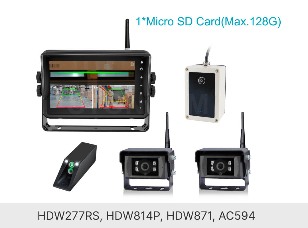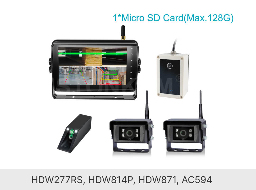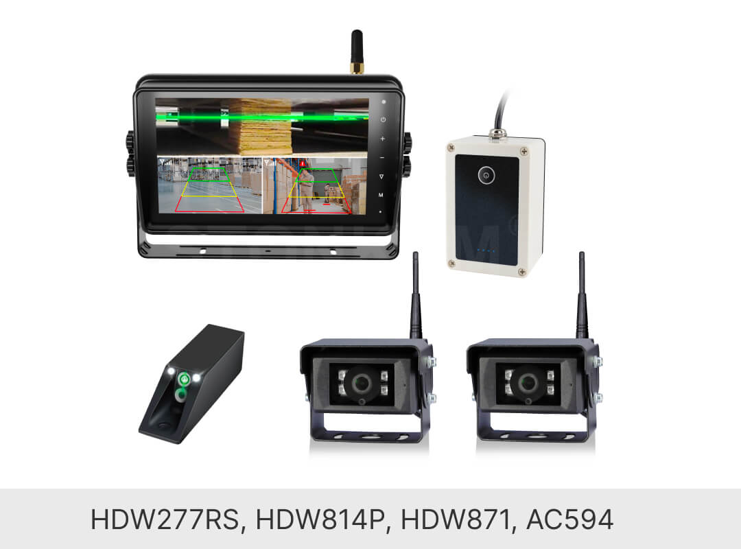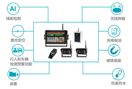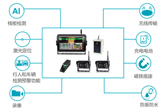 敏视叉车AI无线监控系统安装方便,功能丰富。显示器集AI算法和录像功能于一体,搭配叉车摄像头和其他无线监控摄像头使用,可实现栈板检测、激光定位&AI控灯、行人与车辆检测等多种AI功能,在视线受遮挡的情况下,确保叉车作业安全高效进行。
