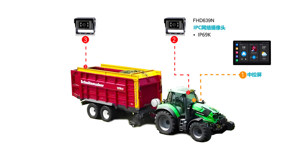 农场作业中,播种机、拖拉机和收割机等大型农业机械常面临驾驶员视野受限的挑战:车周及关键作业部位存在盲区,夜间或恶劣天气下更难掌控全局,容易发生碰撞或误操作;同时,播种行、挂接状态及收割作业点难以实时监控,作业调整滞后,效率低下且资源浪费严重。这些痛点直接影响作业安全与生产效益,是现代农场亟需解决的核心问题。
