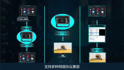 敏视车载无线监控设备通过在农机关键部位布置高清摄像头,实现全方位盲区覆盖与作业环节实时监控,让操作员在驾驶室内轻松掌控农田作业全局,显著提升效率并降低碰撞风险。敏视IPC监控系统兼容ONVIF、RTSP、ISO17215等多种网络协议,能够轻松与车内其他设备互联集成,构建更完善、更高效的智能监控体系。
