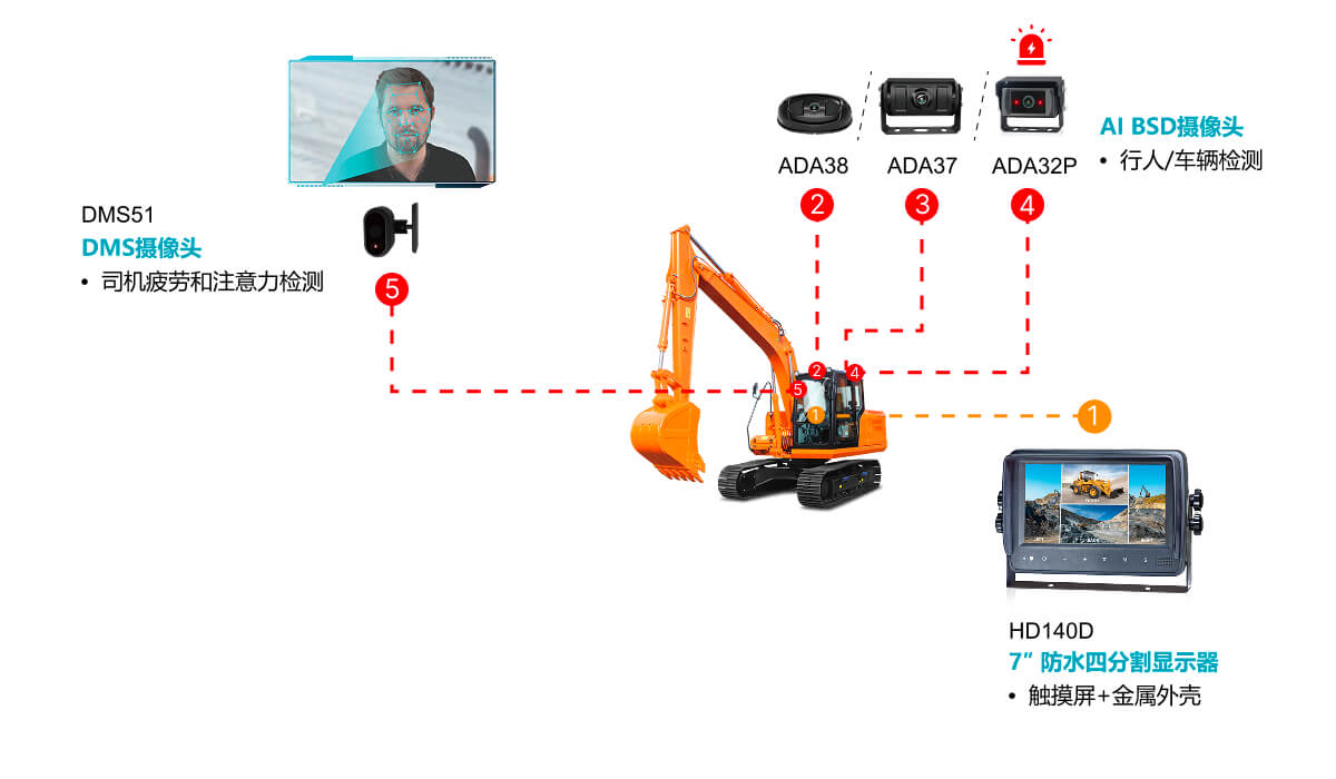 360°全景环视系统实现AI全域检测,支持网络RTSP拉流,支持实时监控画面呈现在车载显示器或者车内中控屏(支持网络触屏协议/CAN 触屏协议),帮助司机安全高效作业。